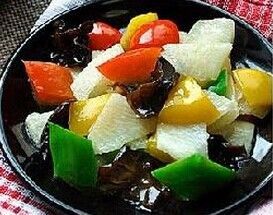 原料:山藥、木耳、青紅黃彩椒各一只(每只只用1/3)、生姜、油。